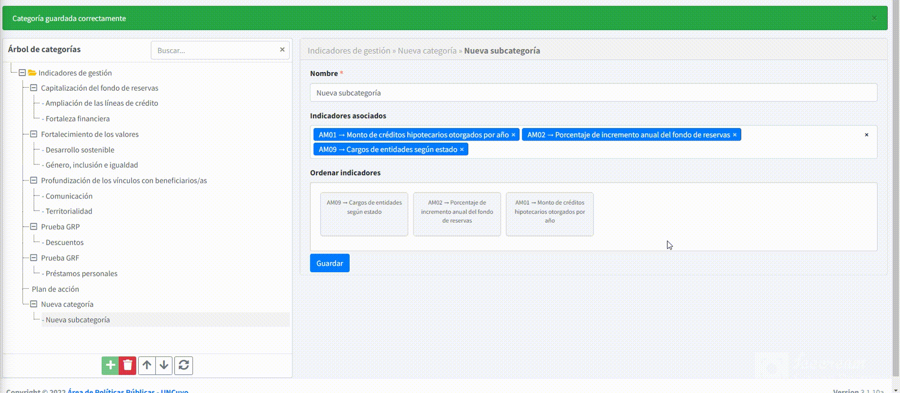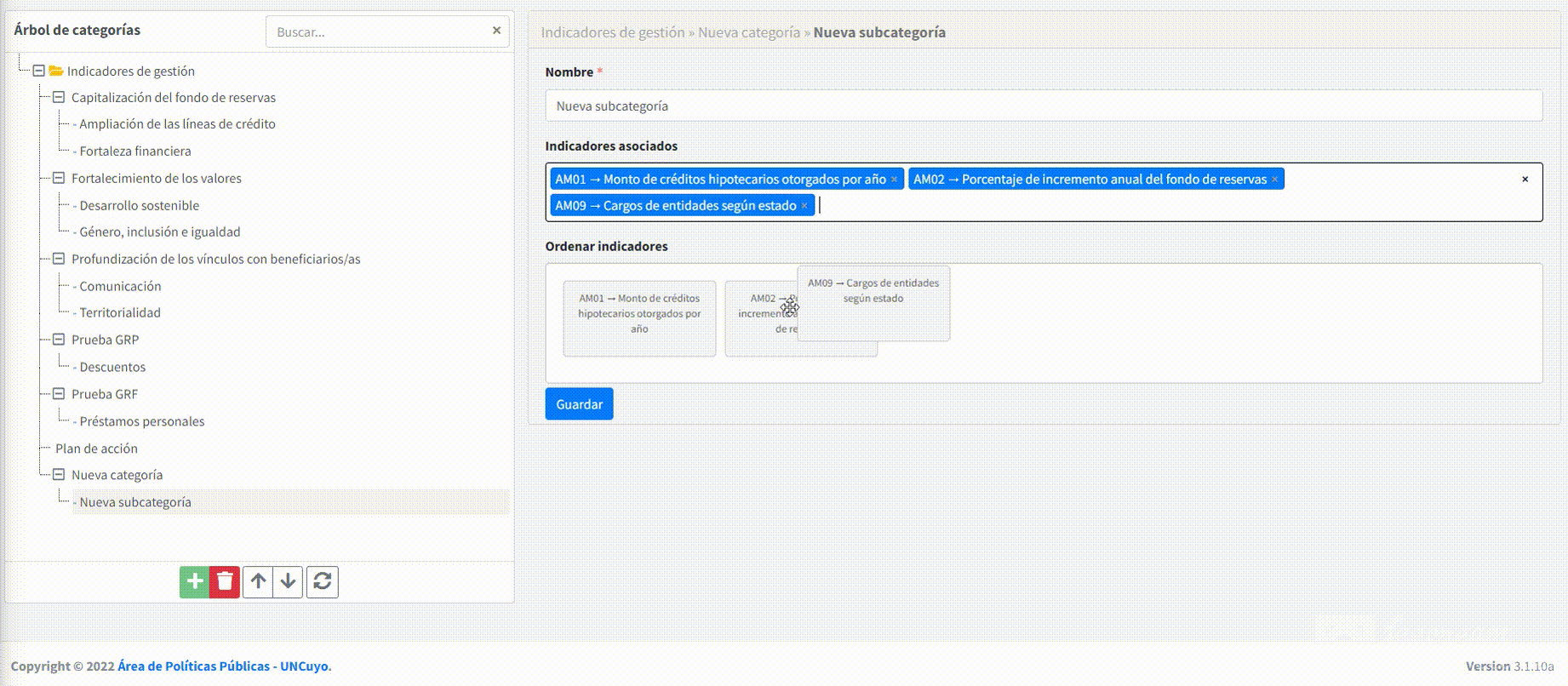 Para ordenar los indicadores asociados a la subcategoría simplemente hay que mantener presionado el indicador que se desee mover y arrastrarlo hasta el lugar que queremos que ocupe.